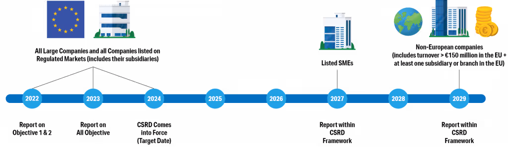 As my colleague Elisa Seith noted in her webcast, the EU Taxonomy, and the Corporate Sustainability Reporting Directive (CSRD) based upon it, will come into force over the next six years. During that time, CSRD will gradually impact a larger pool of companies: publicly traded smaller- and medium-sized entities by 2027, then non-European companies with medium-to-large footprints within the Union.