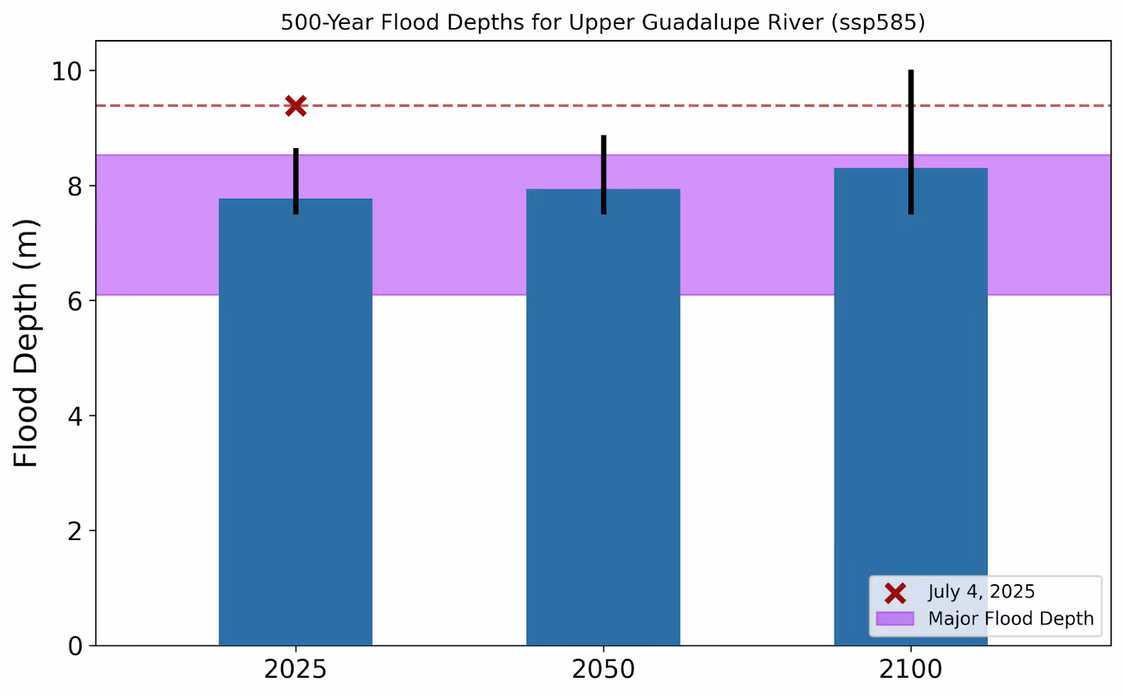 The loss of life was staggering. So was the scale of the hydrological extremes. Jupiter’s flood model identified major flooding along the Guadalupe River, with modeled depths exceeding 30 feet (9.65 m) in some areas. That’s well above the 6-7 meter threshold for “major flooding” according to NOAA.