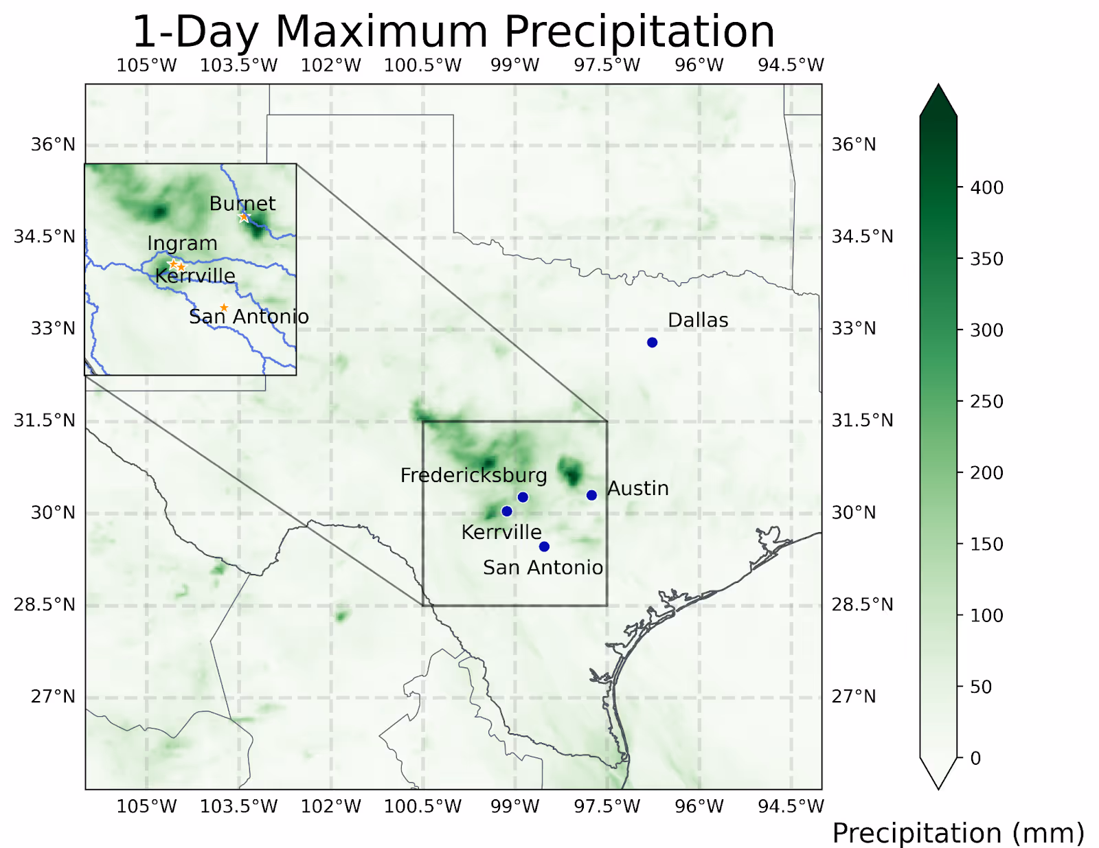 - Short-duration rainfall is key. Flash floods depend on intense bursts of rainfall. This event exemplifies that danger. Localized downpours overwhelmed the region’s rivers, whose steep limestone beds don’t absorb water well. Analyzing flash flooding requires accounting for how short-duration rainfall, local geography, and soil saturation interact – recognizing that forward-looking analytics like ClimateScore Global help assess long-term exposure trends, while near-term flood prediction may require supplemental data and models.