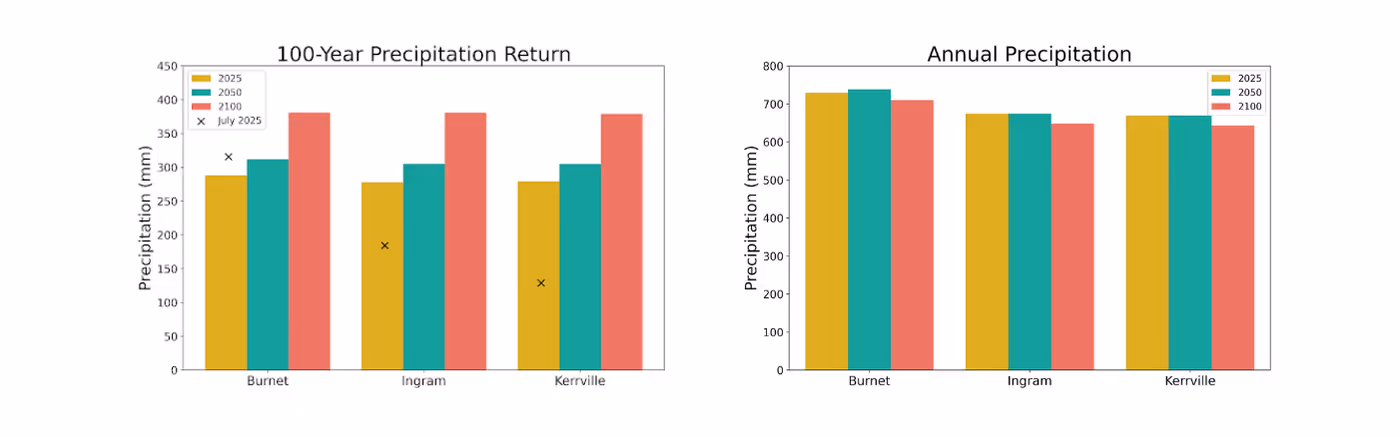 - Total annual rainfall isn’t the issue. Central Texas isn’t projected to get significantly wetter overall in an average year. However, when it rains, it will rain harder and more intensely. ClimateScore Global projects that 100-year rainfall events in this region will contain 10% more rain by 2050, and up to 30% more by 2100.