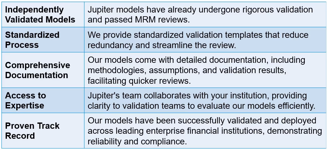 Recognizing the challenges institutions face, Jupiter offers the MRM Accelerator — a comprehensive solution designed to expedite the validation and deployment of climate risk models.