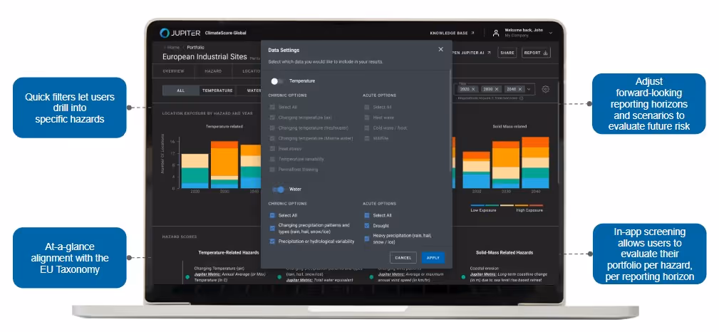 Scientifically Rigorous. Built on Jupiter’s gold standard climate risk analytics, the module ensures data precision and regulatory alignment, reducing compliance uncertainty.