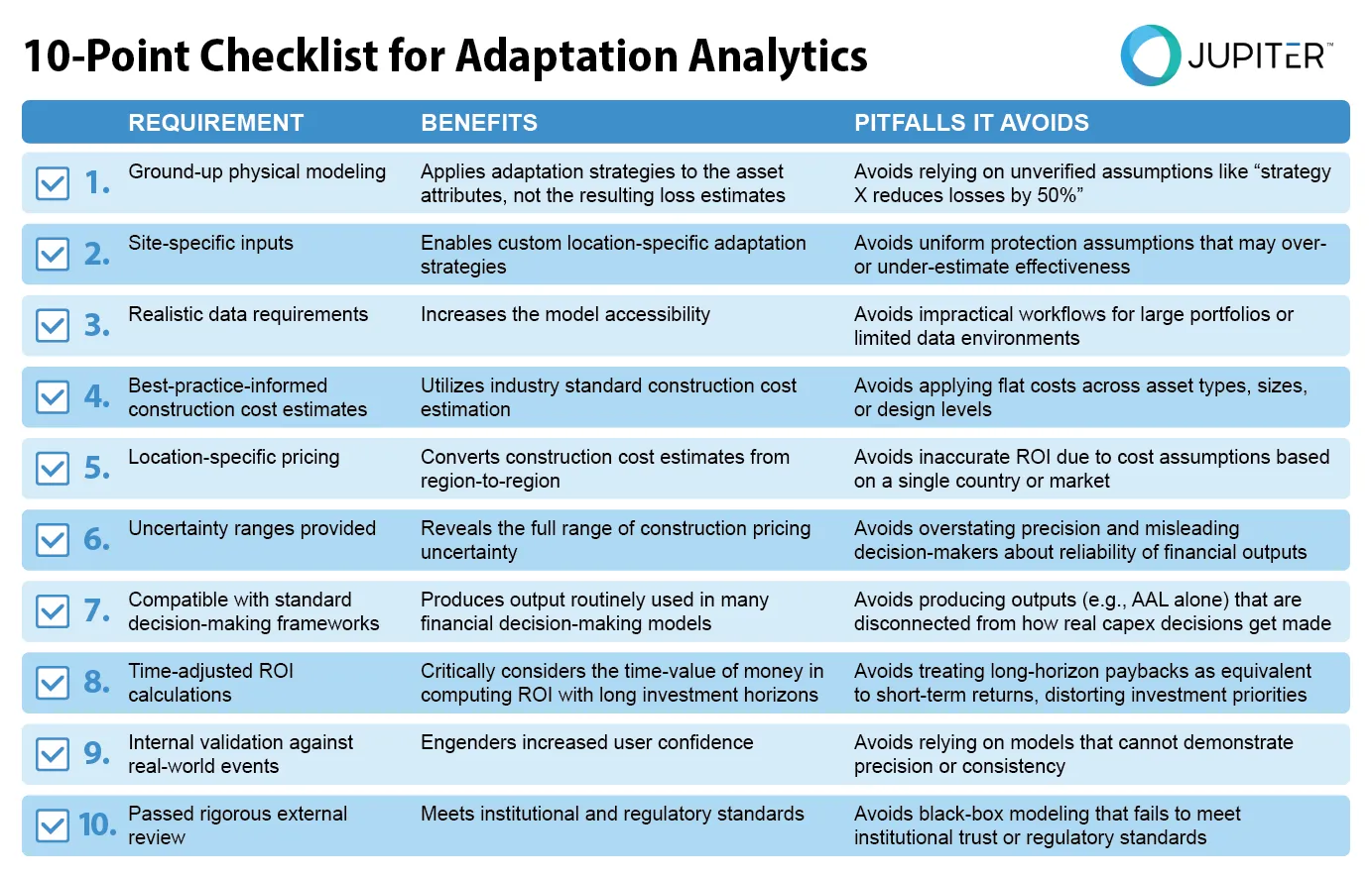 To evaluate whether a modeling platform is worth your investment, Jupiter recommends a 10-point checklist for adaptation analytics.