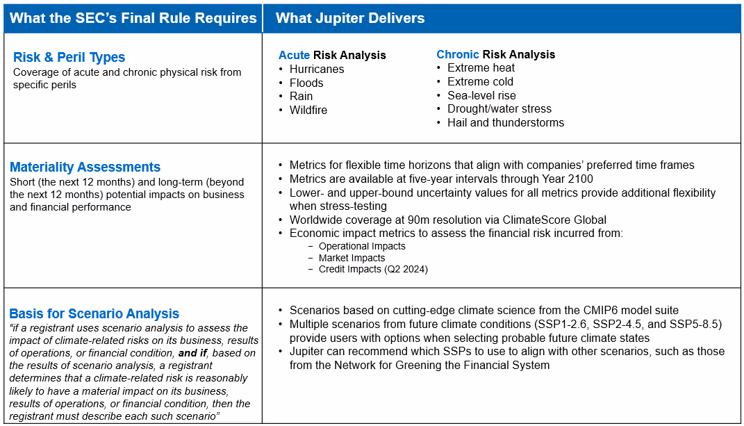 Jupiter is prepared today to help your company respond to these questions and move forward. With ClimateScore™ Global, the gold-standard climate analytics solution, you can leverage high-resolution, forward-focused peril metrics to comply with the SEC’s requirements, swiftly and effectively.