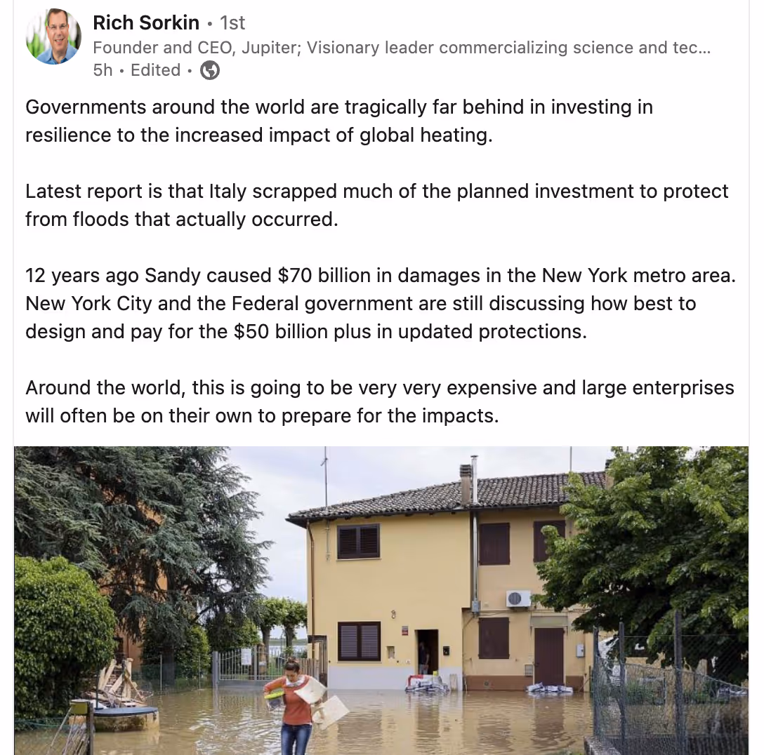 Jupiter’s CEO, Rich Sorkin, shared his perspective on his LinkedIn page just days ago calling on government agencies to get involved now and start investing to build resilience before it’s too late.