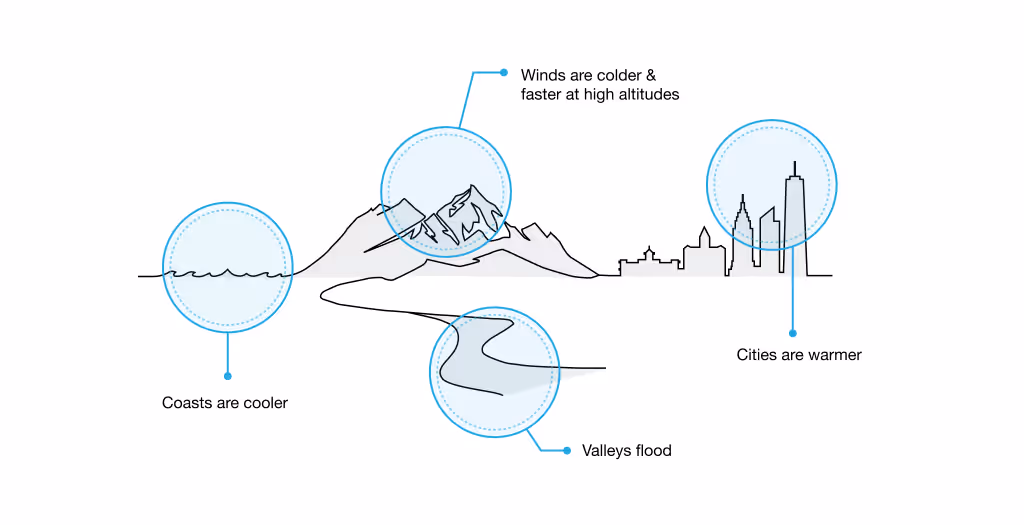 Facilities at the top of a hill, for instance, might be cooler and more wind prone compared to those located at the bottom of a valley, where there’s greater flood risk while factories located in cities are more prone to experiencing a heat island effect.