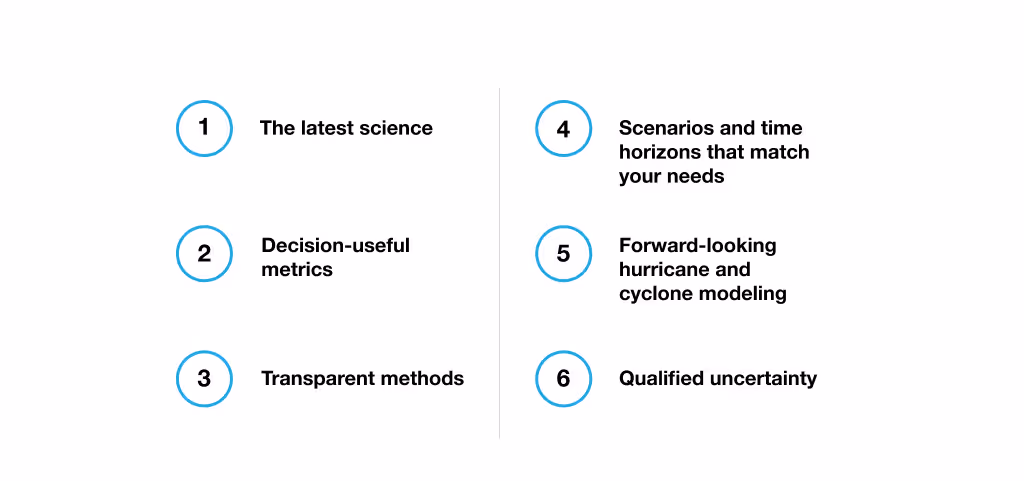 > Downscale climate risk data to a portfolio level from 100,000-kilometer resolution to a 90-meter resolution: We have data for every 90-meter area on the earth’s surface that explains how the key perils of flood, heat, cold, wind, wildfire hail, drought, and precipitation are going to change in five-year increments through to the end of the century