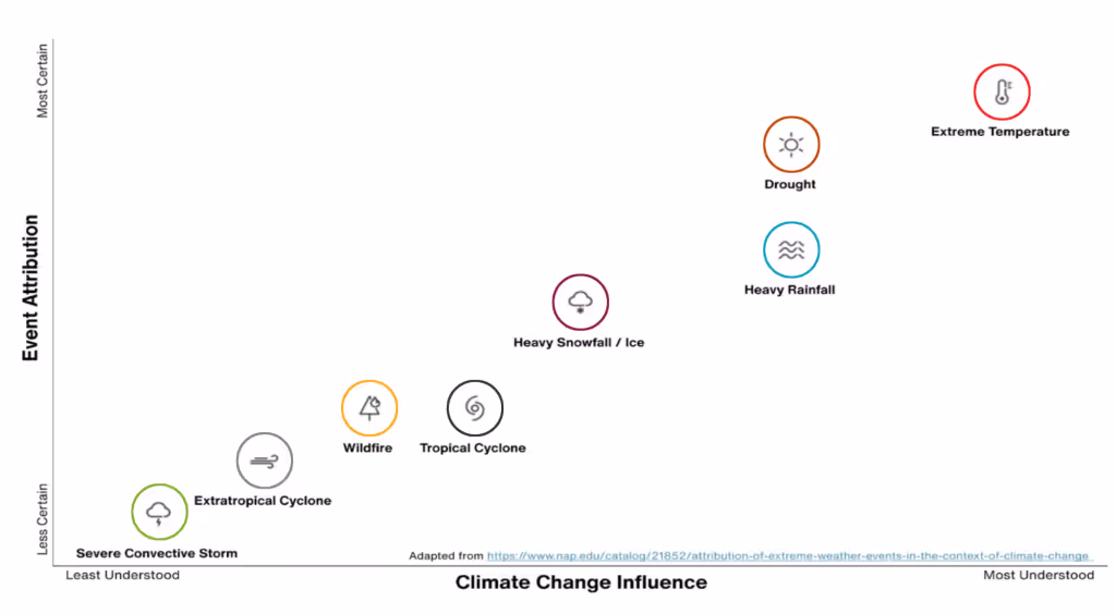 It’s harder to label a specific tropical cyclone as a true indicator of climate change, because tropical cyclones occur less frequently, so scientists need years of data to discern patterns. Consensus has only recently emerged that these events will bring more rainfall in the future, but the jury’s still out on storm tracks and frequencies, and the research is so new it’s not yet in the most recent set of Global Climate Models, CMIP6. The extreme left bottom of the graph reflects that there’s little consensus today about how climate change affects some rare events, like severe convective storms (i.e., tornadoes), that have complex and often conflicting driving factors.